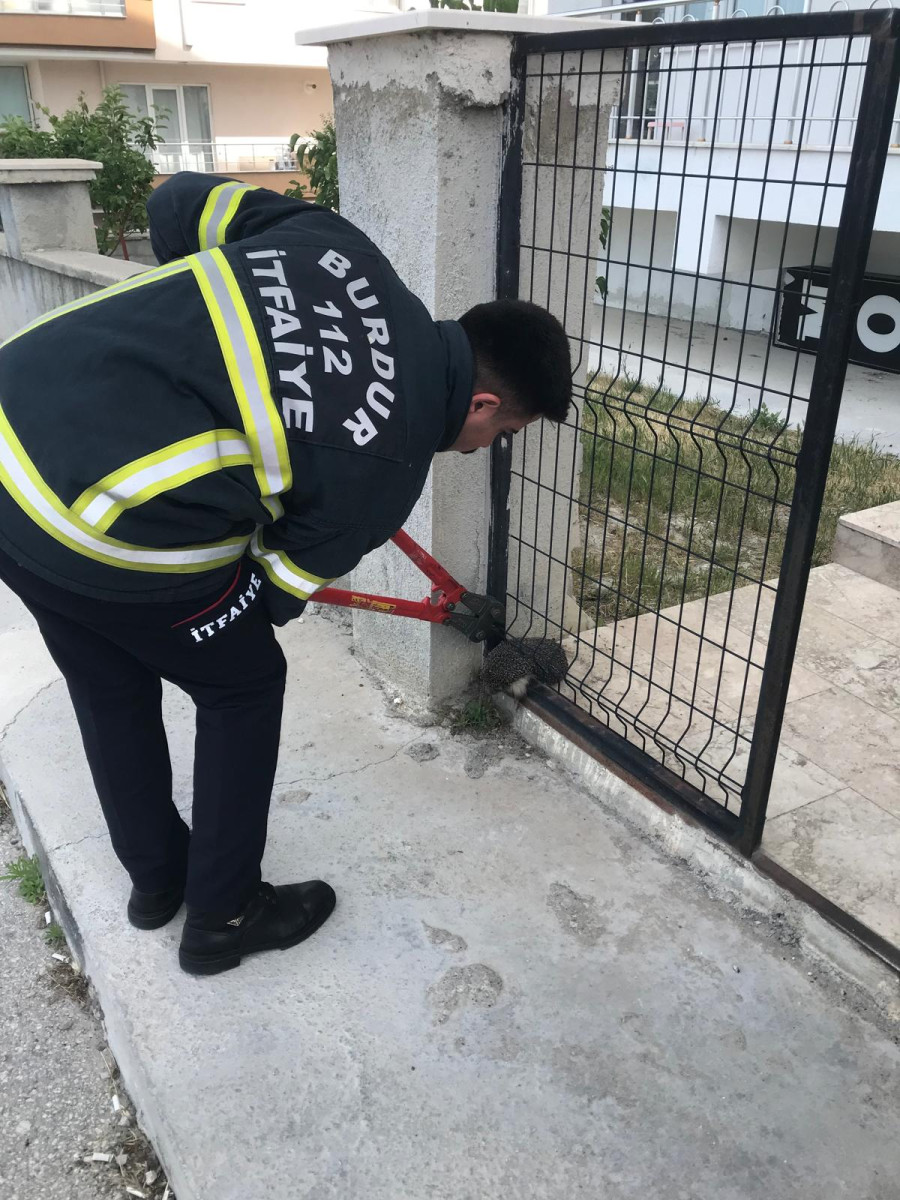 Burdur'da bahçe kapısına sıkışan kirpinin imdadına itfaiye yetişti