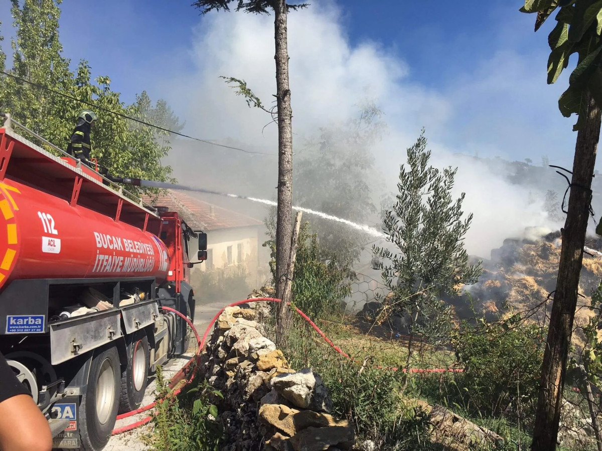 Burdur'un Bucak İlçesi Kuşbaba Köyü'nde kaynak kıvılcımından çıkan yangın, 250 saman balyasını küle çevirdi.