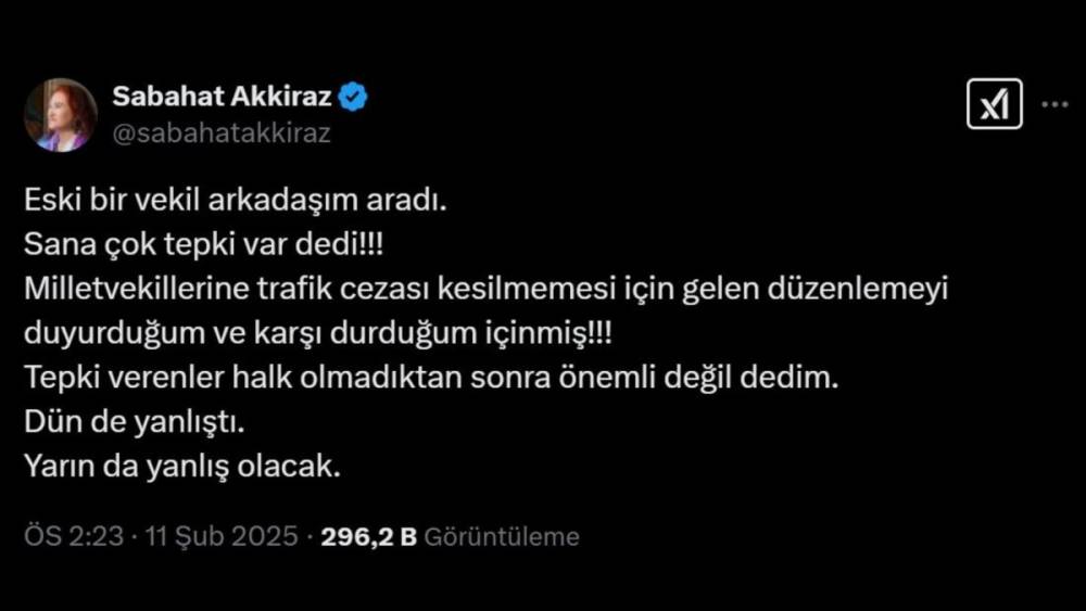 "Eski bir vekil arkadaşım aradı. Sana çok tepki var dedi! Milletvekillerine trafik cezası kesilmemesi için gelen düzenlemeyi duyurduğum ve karşı durduğum içinmiş! Tepki verenler halk olmadıktan sonra önemli değil dedim. Dün de yanlıştı, yarın da yanlış olacak."