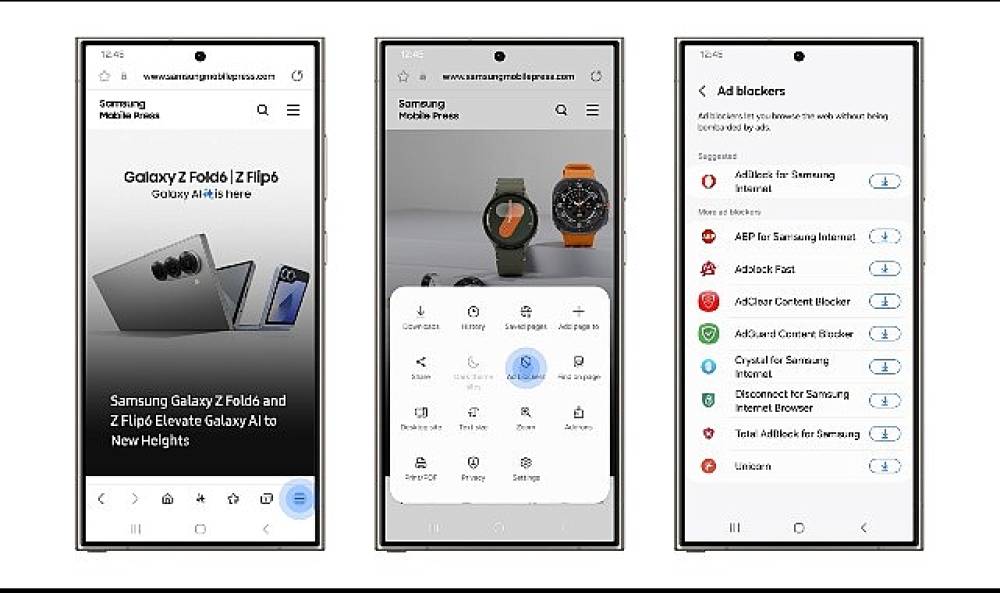 Tüm bunların yanında, Samsung Internet’te reklam engelleyicileri etkinleştirmek de mümkün. İnternette gezinirken daha sorunsuz bir deneyim yaşamak için kurtulmak istediğiniz reklamlarla karşılaşabileceğinizin farkındayız. Bu nedenle üçüncü taraf reklam engelleyicileri indirmenize imkan tanıdık. Samsung Internet tarayıcısını kullanırken reklamları engellemek için, Samsung Internet uygulamasını başlatın ve reklam engelleyicileri seçmeden önce üç çizgi simgesine (menüye) dokunun. Burada, aralarından seçim yapabileceğiniz ve indirebileceğiniz bir dizi reklam engelleyici önerdik.