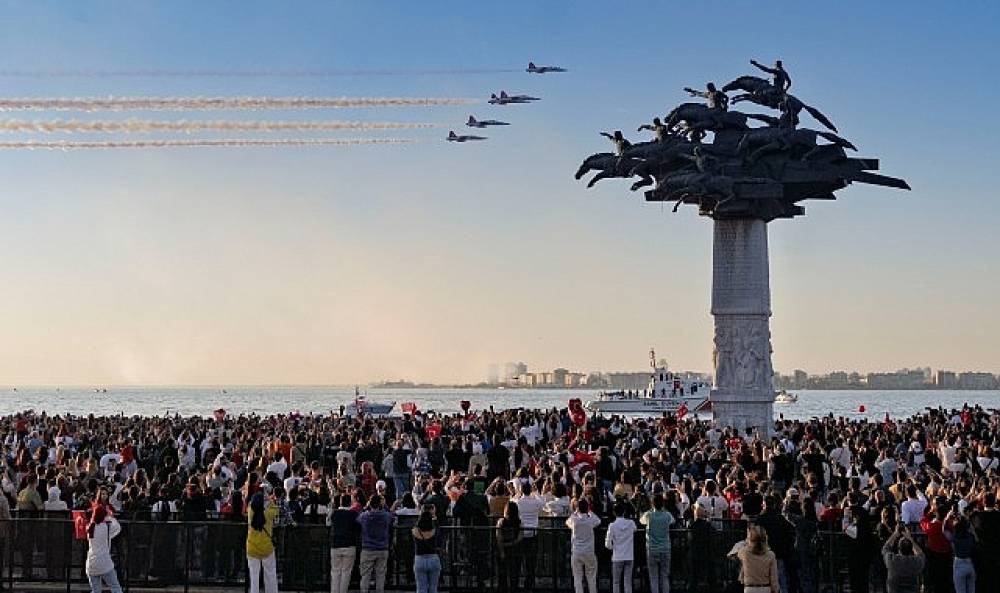 İzmir’de 29 Ekim Cumhuriyet Bayramı coşkusu, Türk Hava Kuvvetleri’nin gururu Türk Yıldızları’nın gösterisiyle tavan yaptı. Yurt içindeki 500. gösterisini İzmir’de yapan Türk Yıldızları’nın şovu, Gündoğdu Meydanı’nda toplananlara heyecanlı anlar yaşattı.