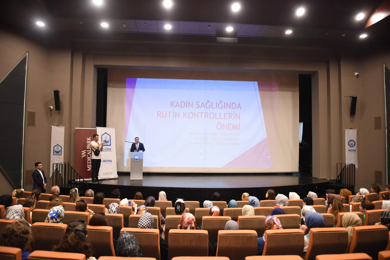 BURSA (İGFA) - Yıldırım Belediyesi ve WM Medical Park Hastanesi iş birliğinde ilçedeki kadınlara ‘sağlıklı yaşamda bilinçlendirme seminerleri’ düzenleniyor. Kadın ve Aile Hizmetleri Müdürlüğü ile Sağlık İşleri Müdürlüğü organizasyonunda Yıldırım’ın 10 farklı noktasında düzenlenecek 10 aylık programlarda kadın doğum uzmanı, diyetisyen, psikolog, estetisyen ve onkoloji doktorlarından oluşan ekip ilçedeki kadınlar ile bir araya gelerek sağlıkta erken teşhisin önemi ve bilinçlendirme üzerine söyleşi gerçekleştirecek ve kadınlar merak ettikleri soruların yanıtlarını uzmanından öğrenmiş olacak. Barış Manço Kültür Merkezi’nde organize edilen programların ilki Op. Dr. Zeynep Toksoy Karaşin’in anlatımıyla ‘Kadın Sağlığında Rutin Kontrollerin Önemi’ konulu seminer ile başladı. Programa Yıldırım Belediye Başkanı Oktay Yılmaz, AK Parti Bursa Milletvekili Emel Gözükara Durmaz, VM Medicalpark Bursa Hastanesi Başhekimi Muhammed İkbal Bakırcı ve kadınlar katıldı.